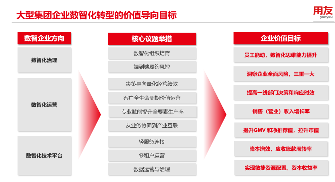 用友認(rèn)為,大型企業(yè)在需求重塑、產(chǎn)業(yè)調(diào)整、政策升級等多重變革力量交織下,數(shù)智化轉(zhuǎn)型難度與日俱增。對于這項復(fù)雜而漫長的工作來說,明確價值導(dǎo)向?qū)⒅破髽I(yè)拾級而上。