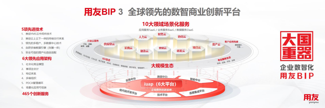 面對難得的市場和產(chǎn)業(yè)發(fā)展機遇,用友經(jīng)過6年的規(guī)模研發(fā)、持續(xù)迭代,以全新理念、全新技術、全新架構、全新模式打造了面向企業(yè)和公共組織數(shù)智化的全新一代產(chǎn)品——用友BIP,并在平臺技術、應用架構、創(chuàng)新服務等方面實現(xiàn)多項重大突破與升級,達到全球水平,包括5項技術、6大應用架構、465項創(chuàng)新服務,覆蓋智能財務、數(shù)智人力、數(shù)智采購、數(shù)智營銷、智能制造、數(shù)智供應鏈、數(shù)智研發(fā)、數(shù)智項目、數(shù)智資產(chǎn)及協(xié)同工作等十大核心領域,是目前全球領域覆蓋較多的企業(yè)云服務群。